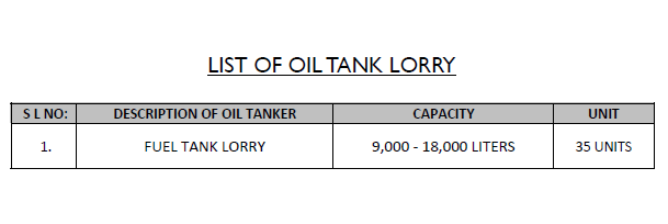 3. 15 NOS. OF TANK LORRY WITH CAPACITY OF 18000 LITERS.