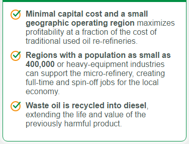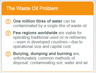 The improper disposal of waste oil has a devastating impact on human health and the environment. Traditional used oil re-refineries are scarce in many regions, leading to environmentally-hazardous waste oil management practices.